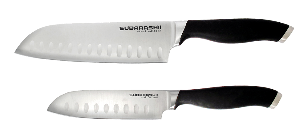 Veitsisarjaan kuuluu kaksi erikokoista Santoku-veistä (terät 5 ja 7 tuumaa), valmistettu ruostumattomasta teräksestä. TPR-kahva takaa erinomaisen otteen niin paloiteltaessa kuin leikatessa.